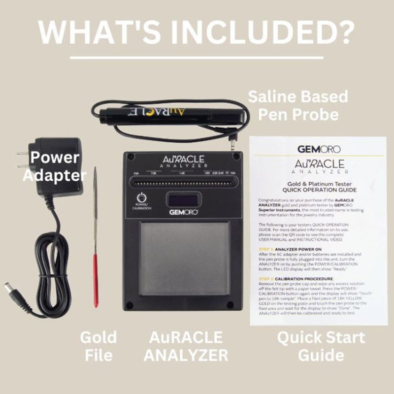 The GemOro Auracle Analyzer with its enhanced features makes using the world's best gold and platinum tester technology even better. The Auracles analyzer takes the AGT-1 tester and improves it with some simple upgrades. The Analyzer tests all gold from 6K to 24K with 20% improved accuracy!