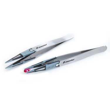 Tweezers D-master can grab Diamond and Gem stones easily and tightly without any scratches, since its tip made of elastomer. D-master doesn't need for you superfluous powers, and it is suitable to work for Mele diamond, Tapered diamond, Diamond up to 3 carats, Gemstones, and more. D-master is Electrostatic discharge tweezers, so that it is suitable to work for Watch parts, IC, and Glass parts.